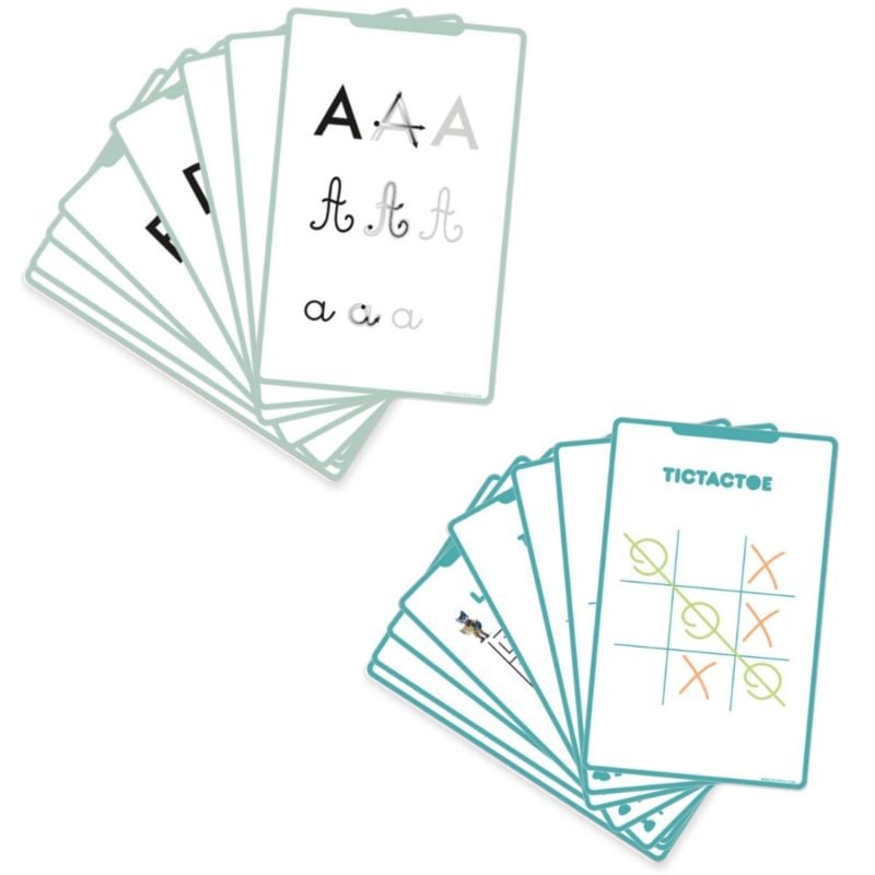 Chaque carte propose une activité stimulante : lettres à tracer, chiffres à recopier, calculs simples à résoudre ou jeux classiques comme le morpion ou les labyrinthes. Grâce à cette approche visuelle et interactive, votre enfant renforce ses acquis scolaires tout en s’amusant seul ou avec un camarade.